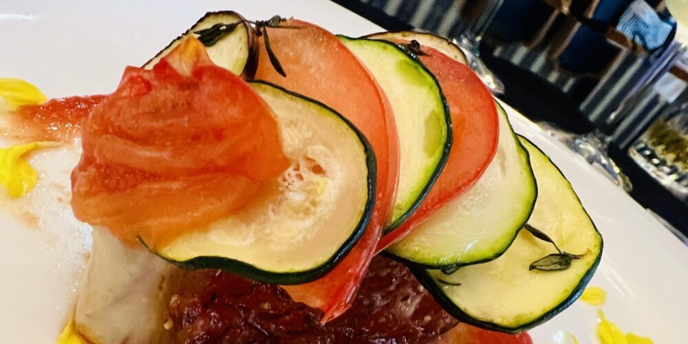 メインディッシュとしてお出ししている魚料理でございます。三崎港直送の新鮮な魚の旨みと、色鮮やかな野菜のティアンが織りなす美しいコントラストを、ひと口ごとにお楽しみください。爽やかな白ワインとの相性も抜群でございます。
