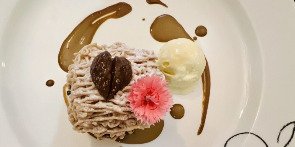 デザートの主役は、シェフ特製モンブラン。この菓子の名は、フランスとイタリアの国境にそびえる「白い山」モンブランに由来する。そして、この菓子こそが、秋という季節を最も雄弁に語る一皿である。