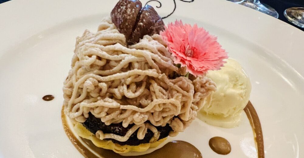 デザートの主役は、シェフ特製モンブラン。この菓子の名は、フランスとイタリアの国境にそびえる「白い山」モンブランに由来する。そして、この菓子こそが、秋という季節を最も雄弁に語る一皿である。
