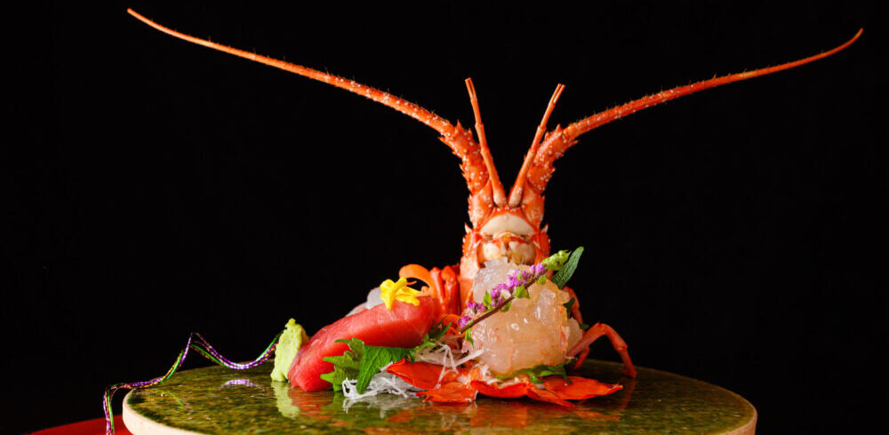伊勢海老の姿造り、本鮪、真鯛――この三つの食材が一皿に並ぶ様子は、まさに海の宝石箱。伊勢海老の透き通るような身は、ぷりぷりとした食感とほのかな甘みが特徴。活きの良さが一目で分かる、目にも鮮やかな姿造りです。