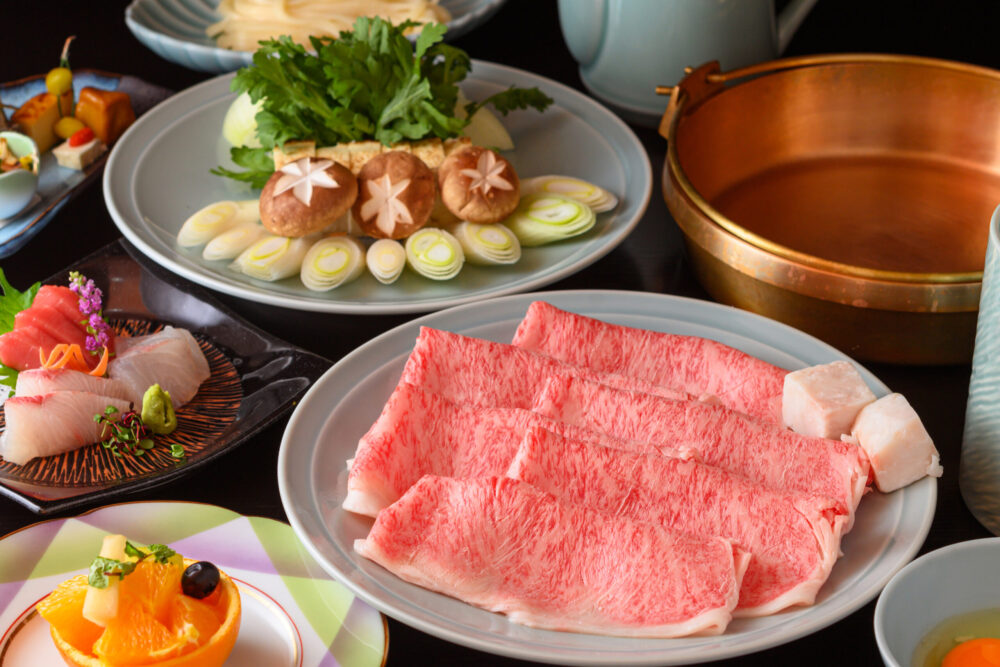 四季折々の食材を用いた前菜やお造りは、お皿の上に日本の美しい四季を表現しております。メインのすき焼きやしゃぶしゃぶだけでなく、会席全体で日本の食文化をご堪能いただけます。