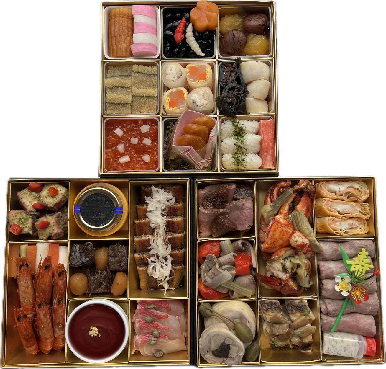 日本料理、フランス料理、イタリア料理という三つの料理文化の粋を集めた、Sun-mi最高峰のおせちです。各国の伝統技法と最高級食材を惜しみなく使用し、新年の食卓を華やかに彩ります。